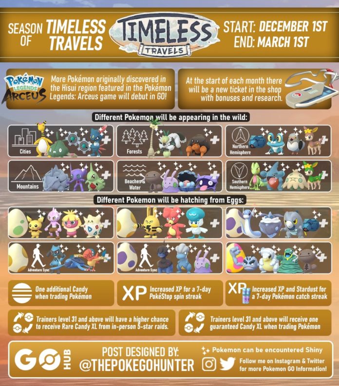 Pokemon Go Timeless Travels Season Reveal Shows Off Hisuian Starter Evolution Timeless Travels is the new Pokémon GO's season, running from December 1, 2023 to March 1, 2024, and it introduces new Pokémon from the ancient Hisui region, as well as an exciting array of winter themed holiday events! Different Pokémon will appear in the wild! As the Season changes, different Pokémon will appear in different […] Main article: A Route to New Friendships Timeless Travels Special Research was available during the Season, starting on December 11th, 2023 Quick Links; Home; Forums; Contact; Discord; Pokédex Hub; GO Pokédex; Scarlet & Violet Pokédex;